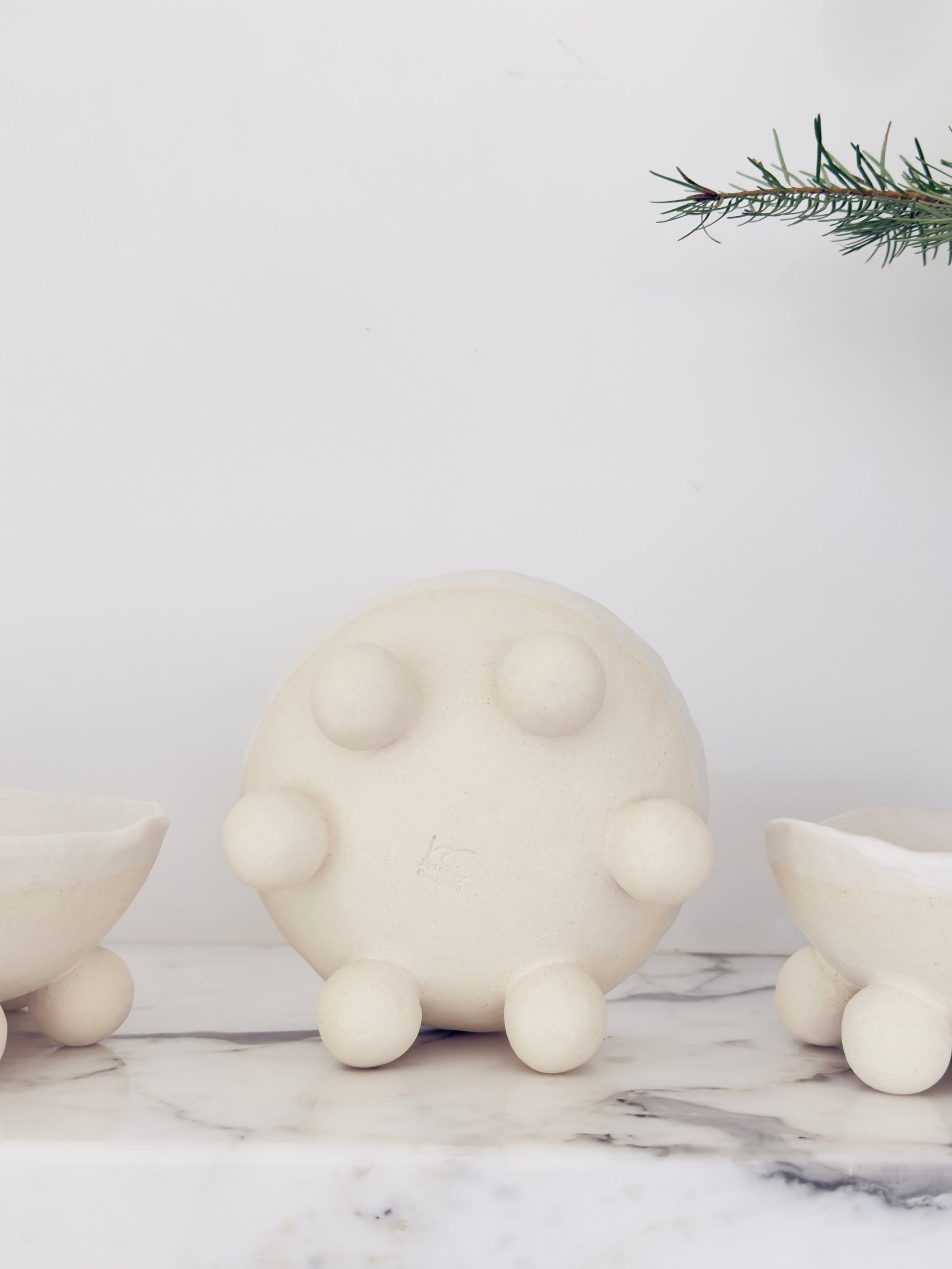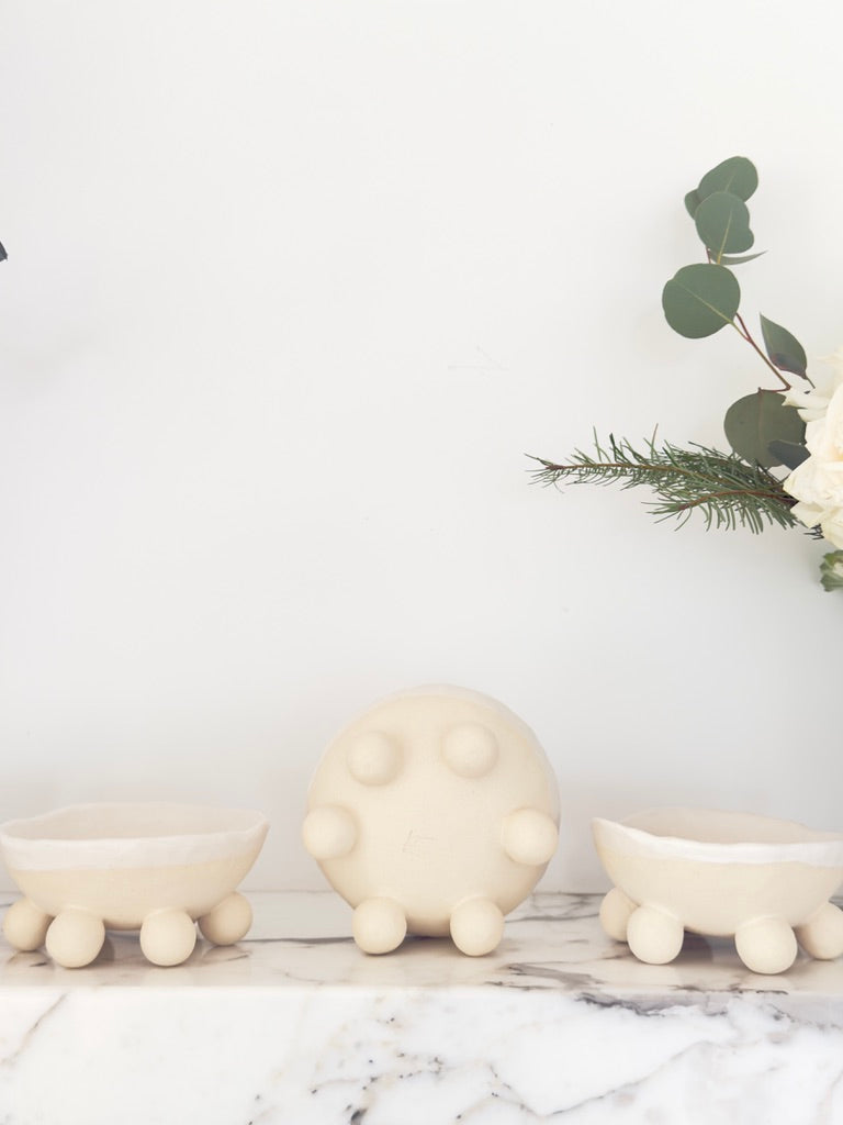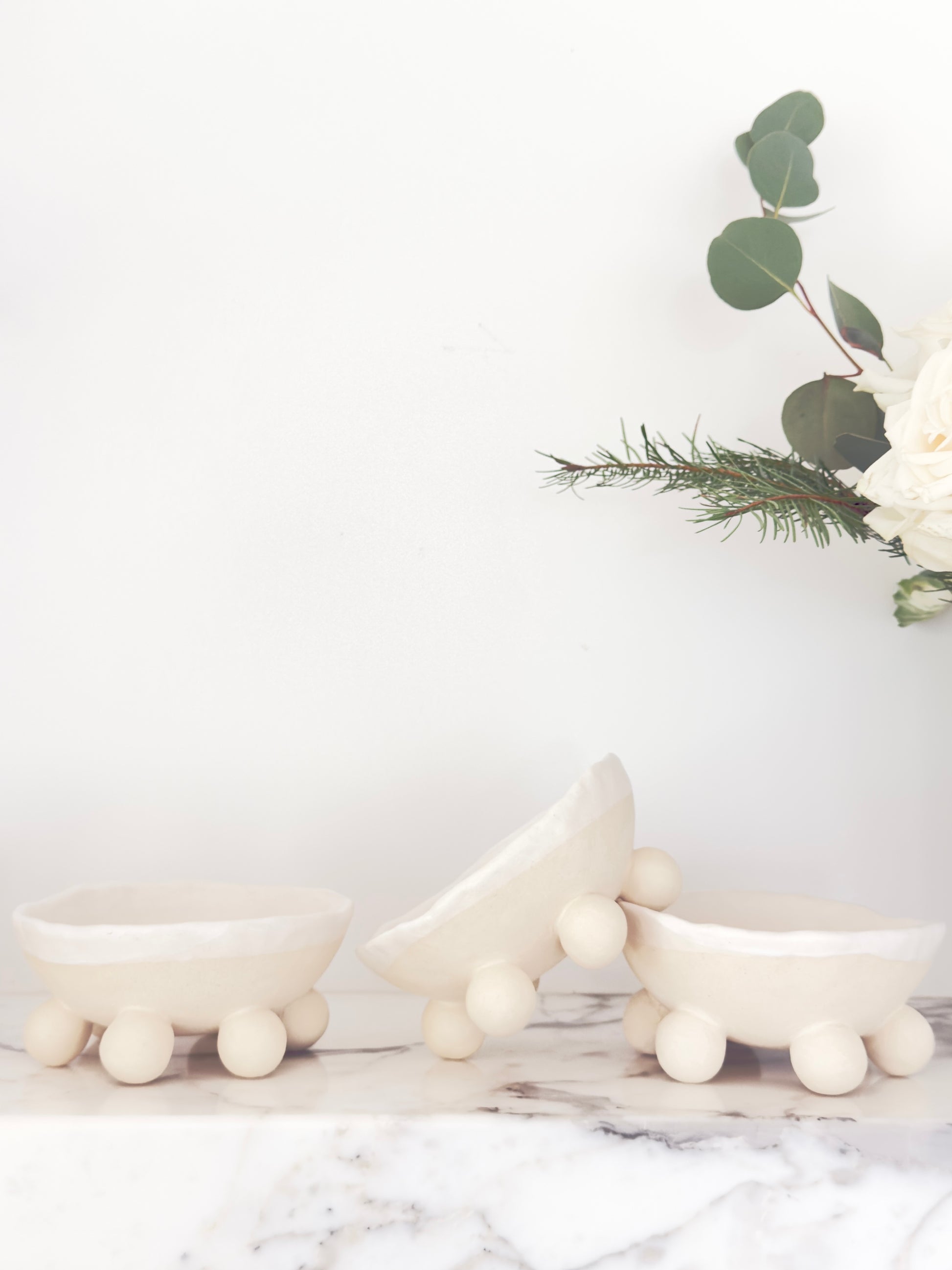 Cheeky balled feet are added to the dip sized bowl so you can add elevation to your appetizer spread. Perfect size for all the knick knacks left on any counter or set anywhere in your home for a pop of homemade elegance.