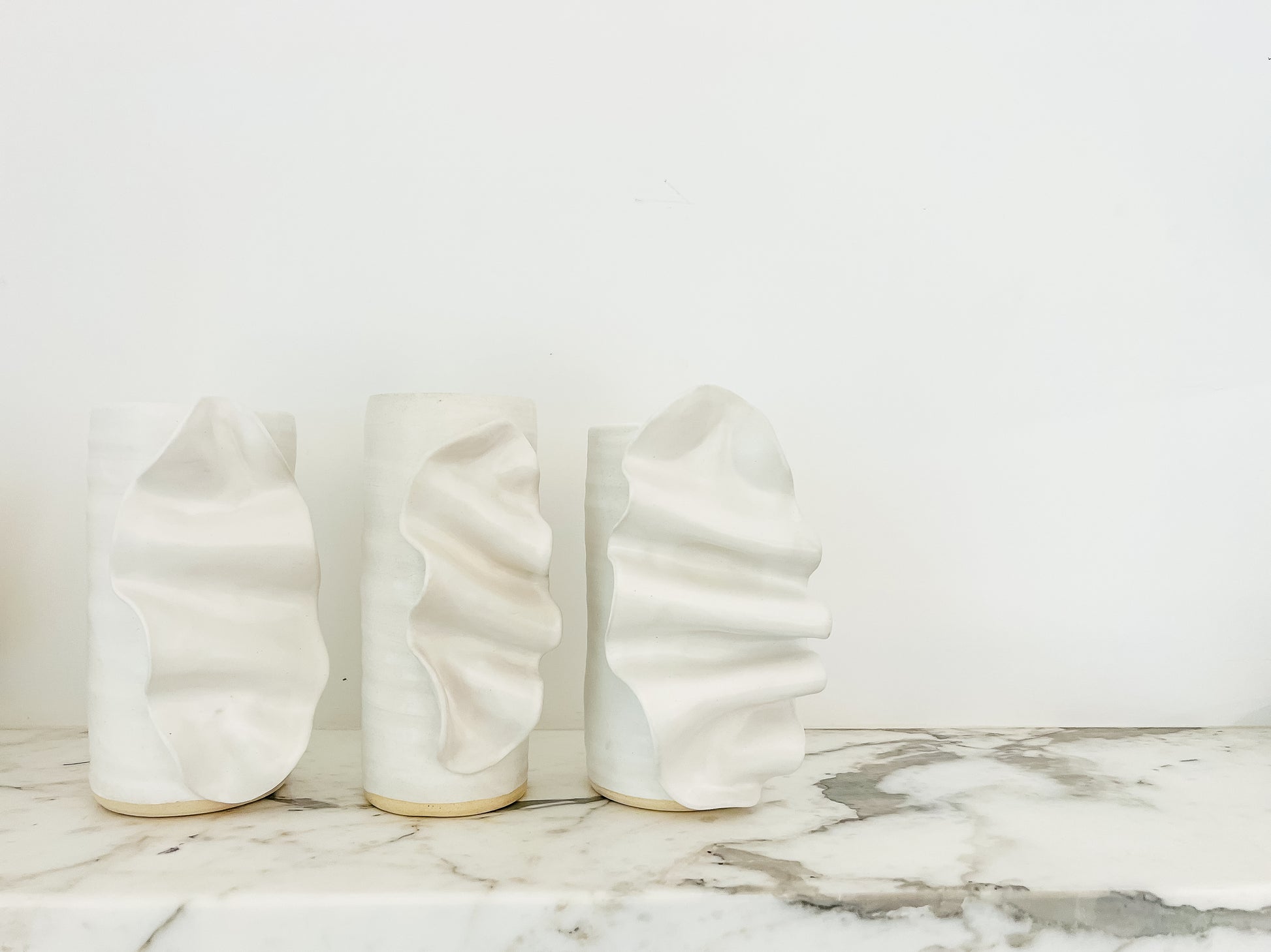 This vase is a show stopper. A ribbon cascades down the side giving an already beautiful vase a dramatic shape that looks stunning from every angle. It will stand alone as a work of art on any shelf. When you have fresh blooms or sticks from the garden make sure use what's sure to be your favorite vase.